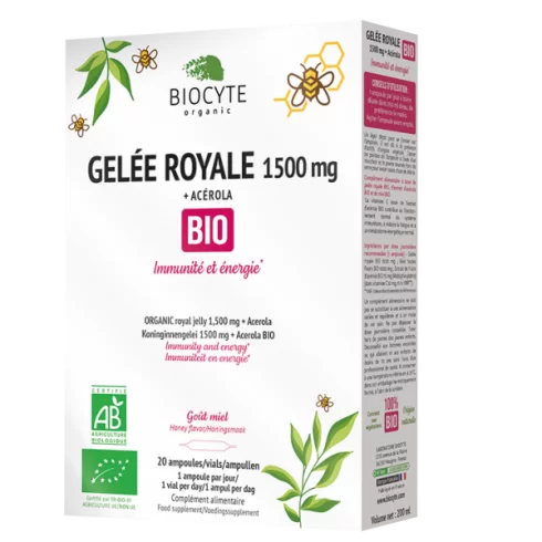 BIOCYTE GELEE ROYALE 1500 mg BIO este un supliment alimentar certificat organic pe baza de laptisor de matca organic si acerola organica, un fruct originar din America de Sud, bogat in mod natural in vitamina C.