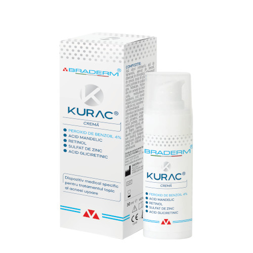 KURAC® crema este o combinatie de Peroxid de benzoil in concentratie de 4% cu Retinol activ, Alfa hidroxiacizi si Zinc, indicat in tratamentul topic al acneei usoare pana la moderate cand sunt prezente comedoane (puncte albe si negre), papule si pustule.